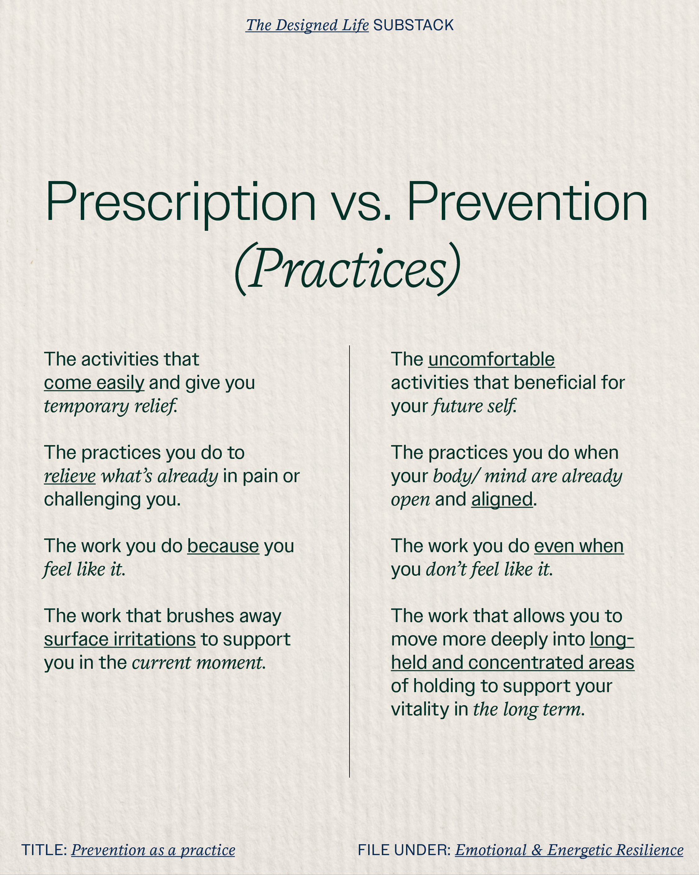 Prevention is doing the work when either 1) your body and mind are already open and aligned (so a prescription isn’t needed), or 2) when something feels just outside your zone of comfort to the point where it feels a little uncomfortable to do.